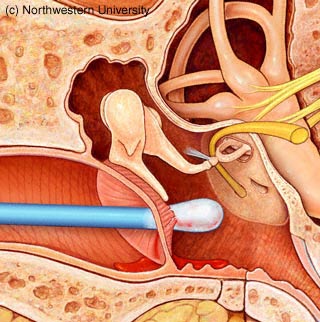 鼓膜穿孔是耳科临床较常见的症状之一,它主要由中耳炎和外伤两种原因引起。鼓膜穿孔使中耳与外界相通,在游泳、洗头或挖耳时细菌容易进入引发中耳炎。反复中耳炎会使鼓膜穿孔增大、中耳粘连硬化,使听力进一步下降。如不适当用药,还可引起内耳神经功能下降,更难医治。更为严重的是,中耳反复发炎可导致骨疡型或胆脂瘤型中耳炎,骨头受侵蚀时有可能导致面神经瘫、脑膜炎、脑脓肿等颅内外并发症,甚至有生命危险。
